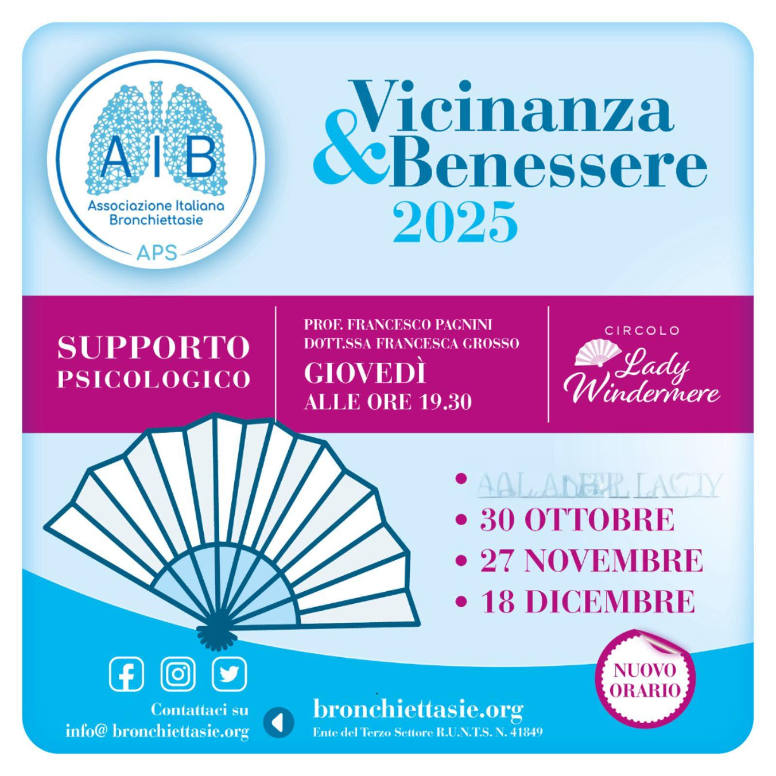 siamo lieti di informarvi che giovedì 30 ottobre alle ore 19:30 riprende il gruppo di supporto psicologico denominato “Il Circolo di Lady Windermere”, uno spazio di ascolto e di partecipazione condotto dal Prof. Francesco Pagnini e dalla dott.ssa Francesca Grosso aperto a coloro che ogni giorno vivono co le bronchiectasie. Un’esperienza che ci sentiamo di consigliarvi, richiedi il link per accedere al Circolo all’indirizzo [email protected]